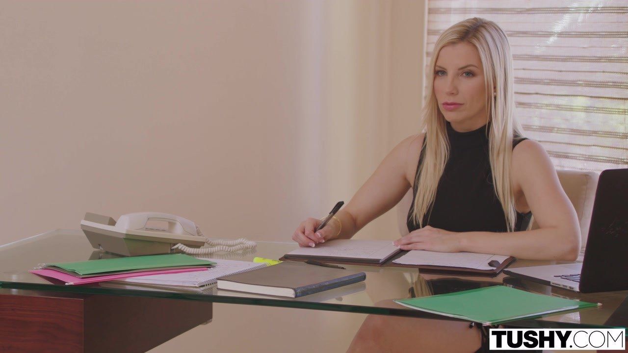 Девушка долго не решается воплотить свою сексуальную фантазию о сексе с боссом на работе, боясь навредить своей карьере. Но он должен скоро уехать в длительную командировку и это подстегивает блондинку к активным действиям. Она уединяется с начальником, и их общение начинается с шикарного минета. Горячая красотка опускается на колени, открывает рот, берёт залупу губами и начинает сладко её посасывать. Затем отталкивает зрелого мужика на спину и примеряет дырку на его члене в позе наездницы. Блондинка страстно скачет, соскакивает и босс перехватывает инициативу. Трахает секретаршу в анал, и затем в рот сверху по самые яйца. Дальше нагибает сучку в позу доги, становится у неё за спиной и имеет в очко, делая размеренные и очень глубокие проникновения. Разворачивает на спину и продолжает анал. Но теперь головка проникает в растраханную дырку более плавно, не причиняя блондинке анальной боли. Больше менять позы босс не собирается. Он только ускоряется для скорейшего оргазма и сливает свежую сперму секретарше на язык.