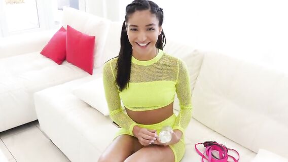 Парень привёл к себе домой симпатичную соседку, которая была сильно напряжена. У подруги пропала собака и она не могла её найти. Но симпатичный молодой человек быстро нашел решение, как помочь красотке снять стресс. Он вынес из своей комнаты большой вибратор и предложил поиграть. Брюнетка развела ноги в разные стороны и, как только приложила вибратор к клитору, моментально забыла про все свои проблемы. По телу начали разливаться приятные волны и через пару минут малышка влажно кончила. Чтобы отблагодарить парня за снятие стресса сама стала на колени, попросила дать член в рот и сказочно его отсосала. Забралась на головку наездницей и начала делать тугие движения, с трудом насаживая узкую щель на огромный прибор, и парень кончил. Он кончил не вынимая и продолжил наполнять юную брюнеточку в других позах, отчего её киска заполнялась липкой белой спермой, которая от своего избытка вытекала обратно. Но парень не останавливался, и последние капли спермы слил камшотом в рот.