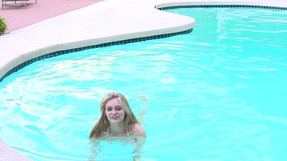 Блондинка в бикини резвится в бассейне и у нее сегодня отличное настроение. Телочка оголяет свои упругие сиськи и уже готова снять все остальное, чтобы приступить к своему любимому занятию. Красотка нежно дотрагивается до бритой киской и явно заводится от собственных прикосновений. Выбравшись из воды, телочка удобно устраивается на шезлонге у бассейна и активно мастурбирует, постанывая от удовольствия. Девушка стоит раком на лежаке и трахает себя страстно пальчиками. Белокурая цыпочка массирует свой набухший клитор до тех пор, пока не почувствует, как из ее киски сочится прозрачная жидкость. Кончив, блондинка нежно поглаживает свое тело от удовольствия.