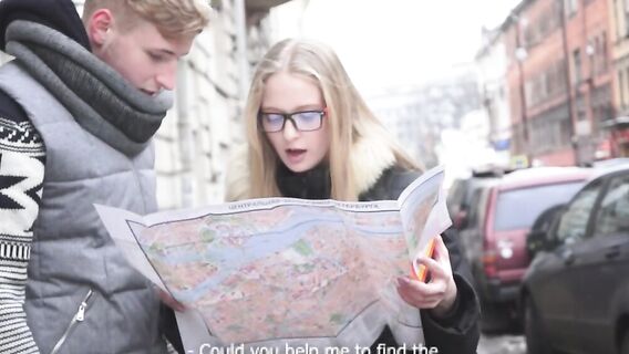 Увидев симпатичную шатенку в очках, которая ходила по улицам города с картой, парень понял, что она заблудилась. Русский парень помог молодой туристке и пригласил ее к себе. В домашней обстановке они принялись с интересом изучать карту города, но, а после их потянуло друг к другу и они слились в нежном поцелуе. Раздев свою новую знакомую до гола, парень сделал ей чувственный кунилингус, а девка в ответ отсосала его мощный член. После такого разогрева парочка занялась жарким сексом на диване и стоны удовольствия были слышны всем соседям. Убедившись, что шатенка испытала оргазм, парень кончил ей прямо на очки.