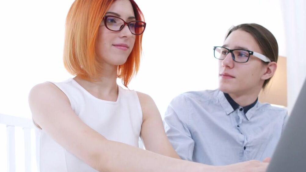 Рядом с этой рыжей девушкой в очках парень чувствует сильное возбуждение, поэтому оторвавшись от ноутбука он решает перейти к более приятным действиям. Парочка сливается в нежном поцелуе, а потом длинноволосый парень делает шикарный кунилингус это милой скромнице с сочной киской. Возбужденная рыжеволосая цыпочка становится на колени, чтобы поглубже заглотить член парня и разгорячить его в ответ. Парень знает, что ботаничка еще ни разу не трахалась в попку, поэтому сегодня он устраивает первый секс в тугую девственную попку. Девушке явно нравится анальное проникновение, и она нежно стонет от кайфа. А потом берет член в рот, чтобы попробовать сперму на вкус.