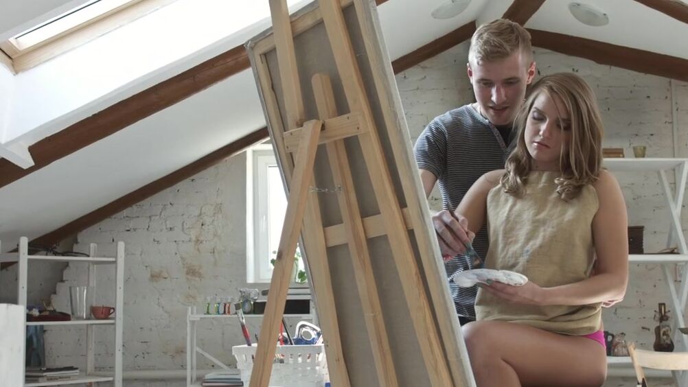 Юной шатенке постоянно нужно черпать вдохновение, ведь она художница. Больше всего эту красотку вдохновляет чувственный секс с ее симпатичным приятелем, который умеет делать шикарный куни. После взаимных оральных ласк этого парня ждет красивый и незабываемый секс с художницей. Он нежно трахает ее сочную дырочку, уложив красотку на мягкий ковер. Прокатившись верхом на крепком члене, девушка кончает, но ей хочется жаркого продолжения. Теперь парень вставляет свой мощный ствол в анал красотки и принимается трахать ее в попку. Художница стонет и извивается от анального проникновения, кончив еще раз она получает сперму на задницу.