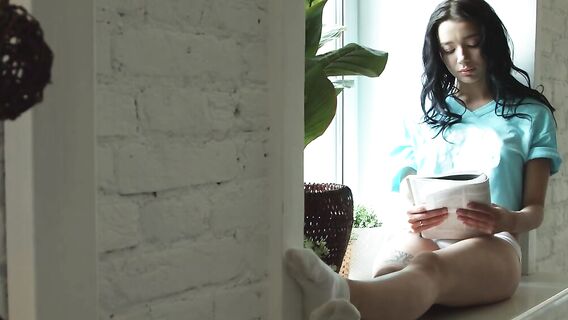 Юная Эмили Бендер зачиталась книгой сидя на окне. Она так красива и притягательна, что парень не смог пройти мимо. Он шепчет ей на ушко, что-то очень личное, от чего она улыбается и страстно впивается в его губы поцелуем. И вот она уже сидит на краю стола, её тело покрывают поцелуи и жаркие прикосновения. Раздвинув ноги, парень целует киску через трусики, ласкает руками грудь и делает всё, чтобы её стон ни утихал. Русская брюнетка обожает качественный куни, она кайфует от каждого движения языка на своей гладкой письке. После такого можно продолжить оральные утехи, раздевшись, она встает на колени между ног парня, который сидит в кресле и снимает с него шорты, оголяя эрегированный член. Гладкий, твердый, он проскальзывает в её ротик и начинается долгий, сумасшедший минет. Ублажив член ротиком, она садится на него сверху, парню остается лишь наблюдать за её движениями и получать удовольствие. Пламя страсти разгорается, и чувственный секс перерастает в более грубый трах. Стоя у стола, он активно трахает её тугую киску, но этого мало, он присаживается и делает ей анилингус, смачивая задний проход и она принимает член в свою тугую попку. Медленно, но уверено он погружается внутрь. Парень укладывает девушку на кресло, ещё обильнее смачивает дырочки и вновь погружается в попку. В позе раком этот потрясающий акт заканчивается, и горячая сперма разливается между ягодиц, заливая вход в анус.