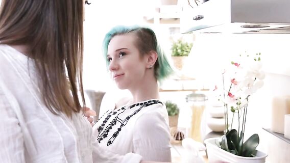 Утренний кофе для двух очаровательных девушек, стал поводом для лесбийских забав. Полуголые и такие сексуальные, они придаются прелюдиям, пока парень наблюдает за ними. Он входит в момент, когда пылкие красотки уже разогреты и попадает в их нежные руки, чтобы испытать радость от жмж. Четыре руки ласкают его тело, брюки растягиваются и возбужденный член попадает в умелые руки. Страстные поцелуи, медленные поглаживания заводят троицу не на шутку. Девушки остаются в одних трусиках, встают на колени и в два ротика ублажают парня, делая ему минет. Стянув трусики с милых попок, парень ставит девушек у стола и жадно вылизывает обе киски, трахая их пальцами под аккомпанемент двойного стона. Нежное куни продолжается, но теперь уже и подружка помогает вылизать пизду своей голубоволосой подружке. Член, наконец, вступает в игру, погружаясь в узкую киску цветной девушки, пока та целует грудь подруги. Скоро парень садится на стул, сверху наездницей запрыгивают брюнетка, жадно поглощая член на всю длину. Снова вернувшись на стол, девушки ложатся в позу 69, и проникновение члена сопровождается оральными ласками. Секс на кухне заканчивается потрясающим камшотом на язычки прелестниц.