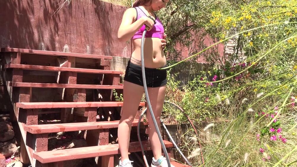 Девушка в коротких черных шортах и топе поливала цветы в саду. В какой-то момент ей стало так жарко, что телочка начала раздеваться. Брюнетка так увлеклась, что разделась полностью. Теперь цыпочка мастурбирует пальцами свою бритую киску на лестнице и кайфует от этого. Возбудившись от собственных прикосновений, девушка с маленькими сиськами опять берет шланг в руки. Но только на этот раз не для того, чтобы полить цветы, а чтобы доставить себе удовольствие. Она обливает водой сиськи, а потом мастурбирует напором воды. От такой дрочки брюнетка реально получает удовольствие и стонет до тех пор, пока ее не накроет волна оргазма.