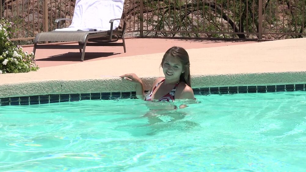 В этот знойный денек симпатичная брюнетка решила немного освежиться в бассейне. Поплавав, красотка снимает с себя соблазнительный купальник и начинает ласкать щелочку, которая уже явно намокла от похоти. Удобно устроившись на шезлонге, голая и мокрая цыпочка с маленькими сиськами начинает активно дрочить свой клитор. Мастурбация красивой загорелой девушки становится все жарче, и красотка вставляет пальцы поглубже в бритую письку, чтобы доставить себе удовольствие. Молоденькая брюнетка с нежными стонами трахает себя в пизду пальцами и кончает от блаженства, чувствуя, как все ее тело содрогается от экстаза.