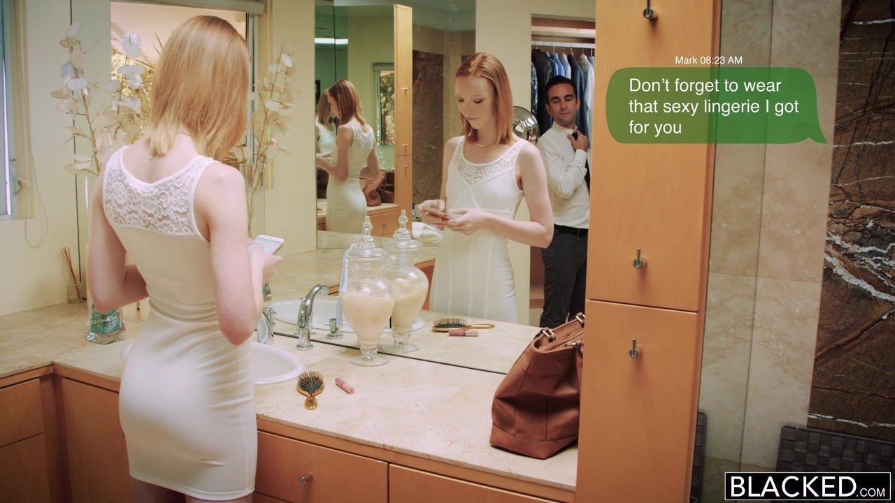 Рыжая красотка имеет всё, что ей хочется в своей семейной жизни, если не считать хорошего секса. Поэтому худая девушка и заводит роман со своим чернокожим боссом, с которым иногда проводит время в постели. Когда негр присылает сообщение с просьбой о встрече, красотка сразу собирается и едет, не обращая внимания на слишком подозрительного мужа. Негр тащит девушку в кровать, раздевает, раздвигает ляжки и начинает лизать бритую киску. Звонит муж, сучка врёт, что занята делами и, положив трубку, изменяет с негром, лаская его член. Это занятие ей нравится гораздо больше, чем простая болтовня по телефону. Поэтому девушка не стесняется жадно строчить губами и дрочить негру рукой. Укладывает босса на спину, забирается в позу обратной наездницы и прыгая на большом члене верхом, трёт саму себя пальчиками по пилотке. Опять отсасывает и возвращается на член, но теперь негр видит перед собой маленькие сиськи любовницы. Скидывает с члена, ставит перед собой рачком и ебет большим членом во влагалище сзади. А когда собирается кончать, поворачивает сучку к себе лицом и сливает сперму на лицо и язык.